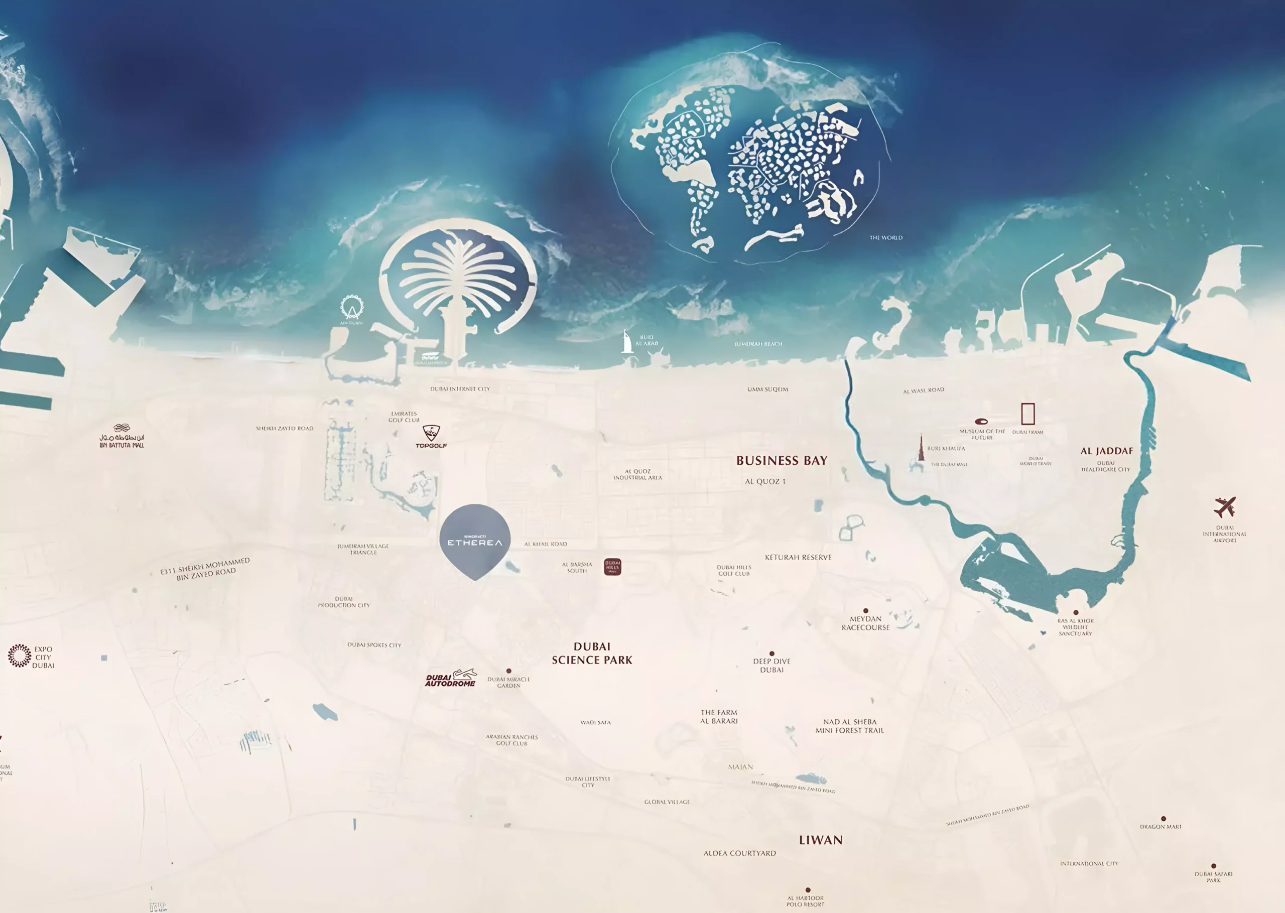 The master plan of Binghatti Etherea is structured to optimize vertical efficiency while maintaining vibrant ground-level interaction within Jumeirah Village Circle. The tower integrates an underground level and basement for services, five dedicated parking floors to separate vehicle circulation from residential access, and 22 upper floors exclusively for living spaces, ensuring privacy and seamless movement. At podium level, the 5th-floor amenity deck acts as a social and wellness nucleus, featuring pools, landscaped lounges, and fitness zones arranged to maximize sunlight control and city views. Ground-floor commercial units activate the street frontage, enhancing walkability and daily convenience. Clear pedestrian pathways, controlled entry points, and thoughtfully layered landscaping complete a compact yet highly functional urban master plan designed for both residents and investors.