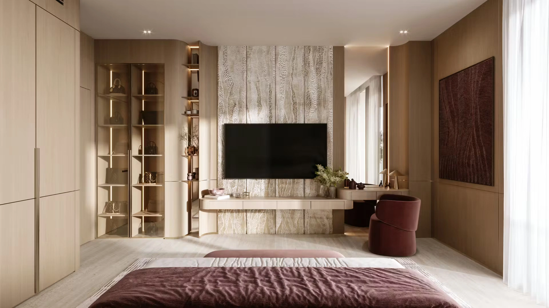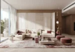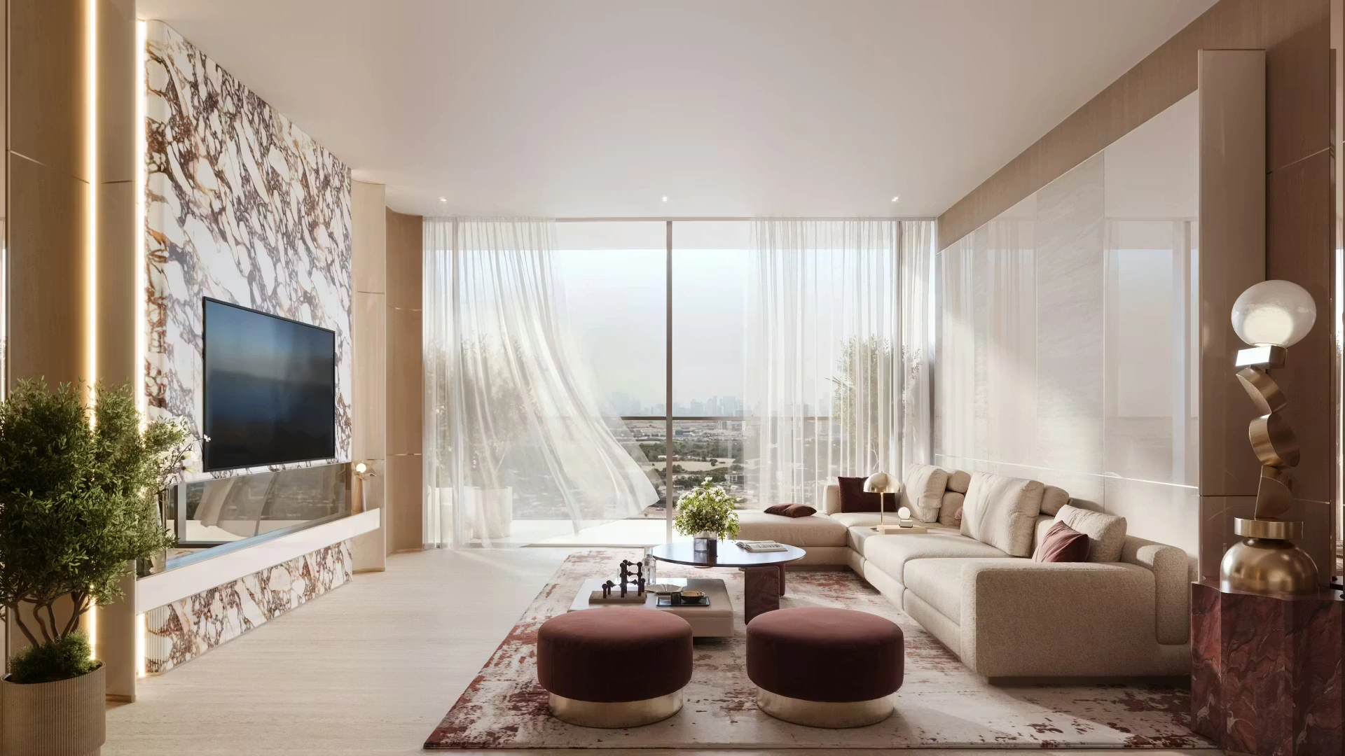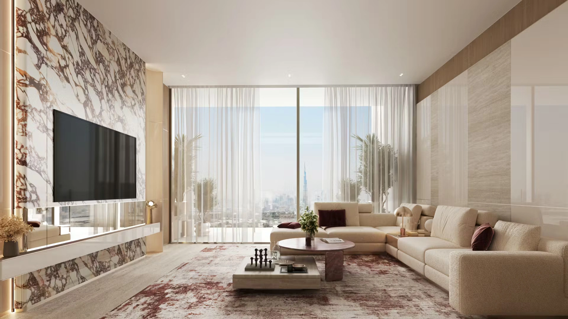 Windows are oriented to maximize natural light and neighborhood views, while protruding balcony elements provide shade and depth. Interiors feature neutral warm tones, large-format stone-look tiles, sleek kitchens with islands or peninsulas, built-in wardrobes, and open-plan living concepts that enhance spatial flow.